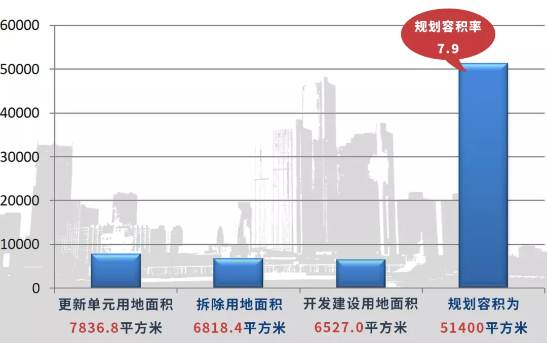 ▲更新單元用地面積7836.8平方米,拆除用地面積6818.4平方米,開(kāi)發(fā)建設(shè)用地面積6527.0平方米,規(guī)劃容積為51400平方米,規(guī)劃容積率7.9。