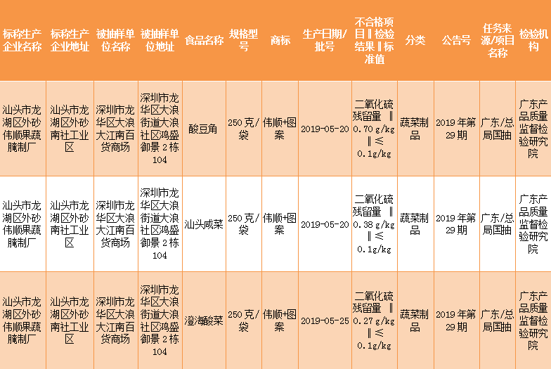龍華大浪大江南百貨商場(chǎng)賣(mài)的酸豆角、汕頭咸菜和澄海酸菜因二氧化硫殘留量超標(biāo)上黑榜了