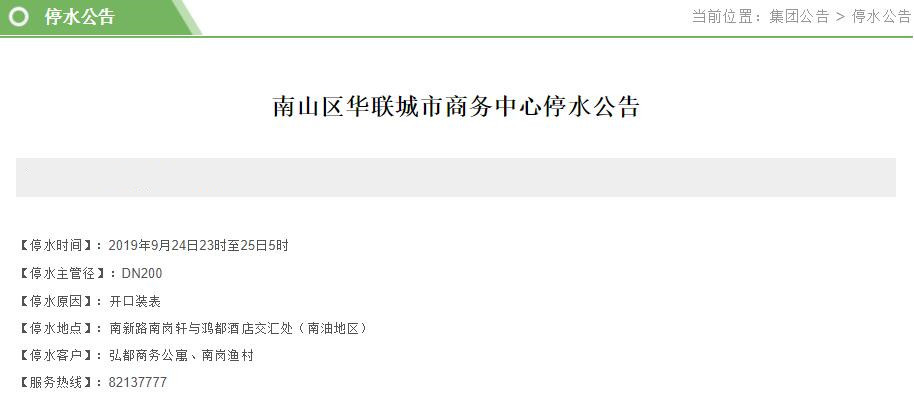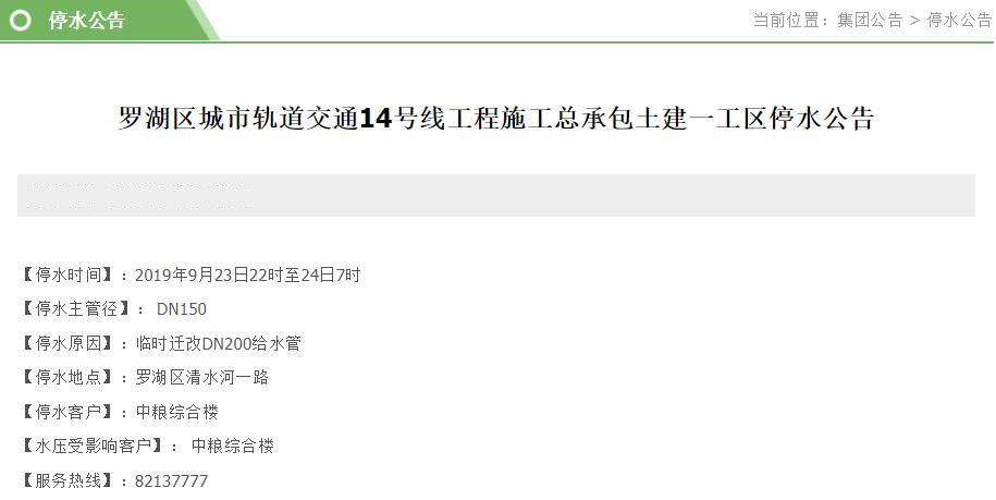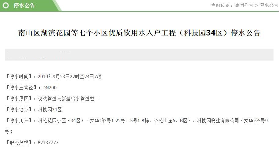見圳客戶端?深圳新聞網(wǎng)2019年9月22日訊 近日,深圳水務集團官網(wǎng)陸續(xù)發(fā)布停水公告。深圳新聞網(wǎng)記者了解到,9月23-24日,福田、南山、羅湖等區(qū)的多個小區(qū)和企業(yè)單位將受影響,請市民提前做好儲水準備。