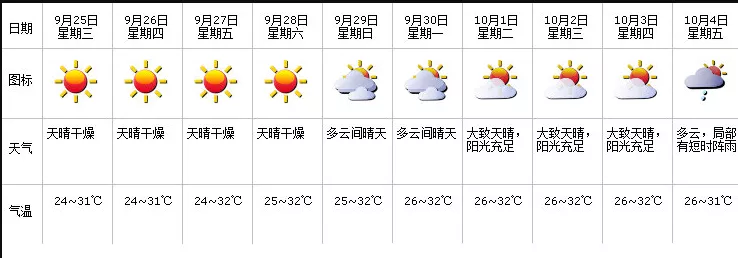 據(jù)市氣象局預(yù)計,國慶假期前半段天氣整體晴好 ,看到這一排小太陽超開心的有木有?!