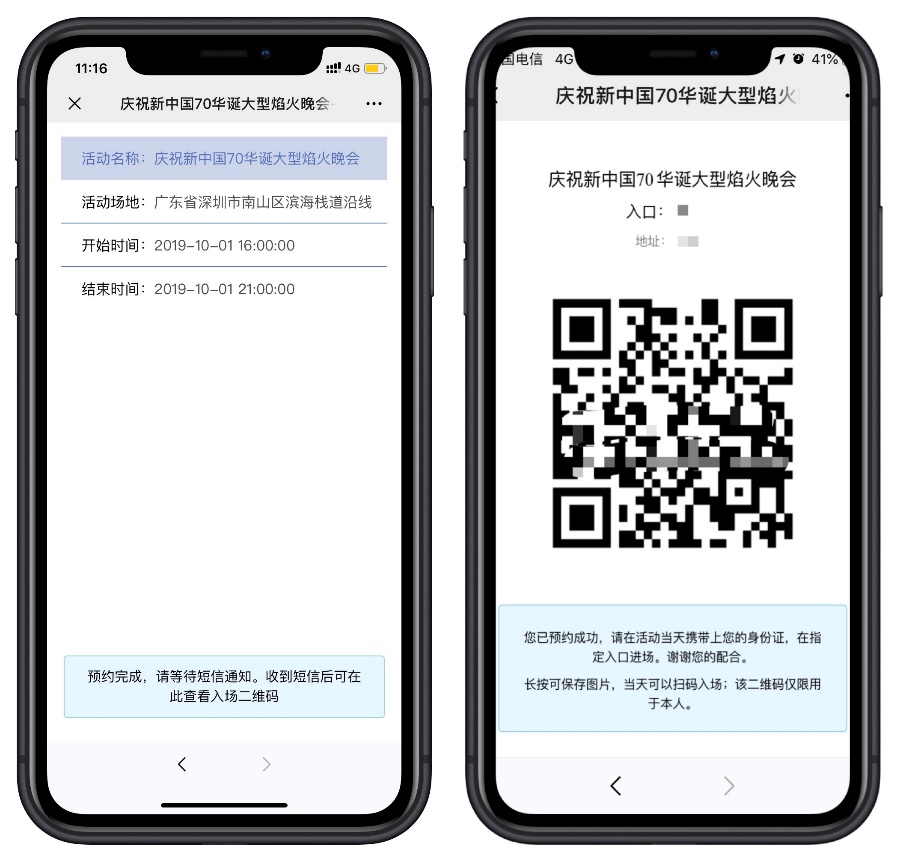 2.預(yù)約成功后將收到短信,預(yù)約頁面將生成二維碼,市民需憑此二維碼及本人身份證入場,如下圖所示: