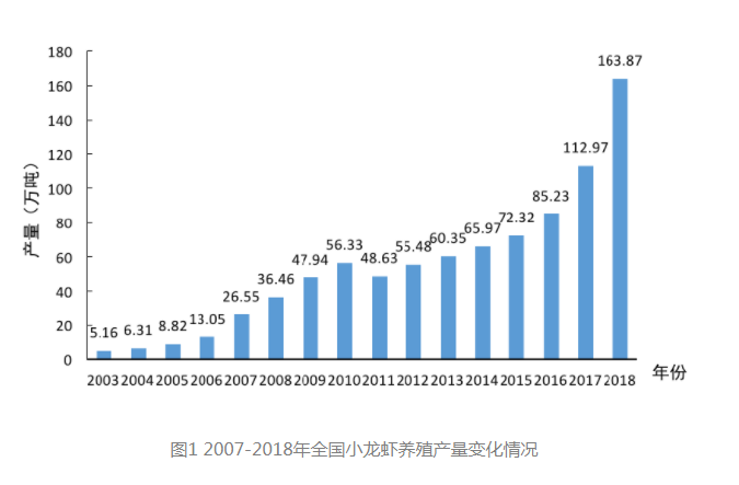 隨著生活水平的提高,人們對(duì)“食”提出了更高要求,色香味俱全的美食往往也更讓人難以抗拒?;疱仧拘↓埼r作為當(dāng)代青年人的“最愛”,已獨(dú)得恩寵許多年,尤其是小龍蝦。每年夏季,是吃小龍蝦的旺季。據(jù)部分媒體不完全統(tǒng)計(jì),光南京一個(gè)城市每年的龍蝦消費(fèi)量都超萬(wàn)噸,而北上廣深蓉5個(gè)城市,小龍蝦門店數(shù)均超3000家。此外,據(jù)2019年中國(guó)小龍蝦產(chǎn)業(yè)發(fā)展報(bào)告顯示,小龍蝦產(chǎn)業(yè)總產(chǎn)值達(dá)3690億元,占據(jù)了第三產(chǎn)業(yè)產(chǎn)值的主導(dǎo)地位。這種巨大的消費(fèi)力帶動(dòng)了小龍蝦養(yǎng)殖業(yè)的發(fā)展,到2018年,全國(guó)小龍蝦養(yǎng)殖產(chǎn)量已超163萬(wàn)噸。