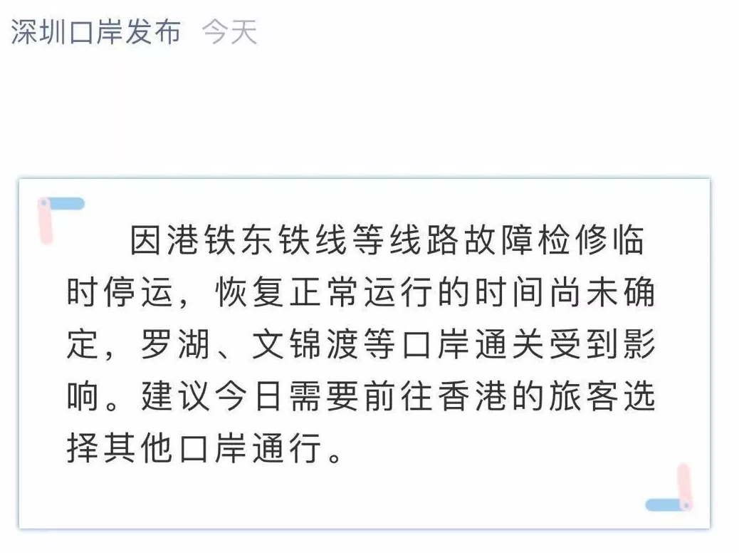 昨天上午11點,深圳市口岸辦官方微信號“深圳口岸發(fā)布”發(fā)布消息:因港鐵東鐵線等線路故障檢修臨時停運,恢復正常運行的時間尚未確定,羅湖、文錦渡等口岸通關(guān)受到影響。建議今日需要前往香港的旅客選擇其他口岸通行。