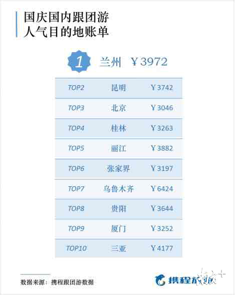 哪些國內(nèi)旅游城市是今年國慶的贏家?根據(jù)攜程跟團游,最受游客歡迎的國內(nèi)旅游城市前十分別是蘭州、昆明、北京、桂林、麗江、張家界、烏魯木齊、貴陽、廈門和三亞。其中前往蘭州人均花費近4000元。