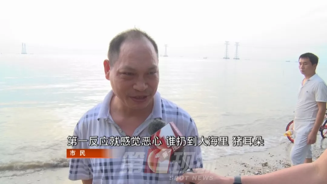 在寶安區(qū)金灣大道旁的休閑海灘,緊挨著西灣濱海公園,風景不錯。不過,沿著沙灘南行300米,卻出現(xiàn)和景色完全不符,十分倒胃口的場景,沙灘上遍布著成片的豬耳朵。