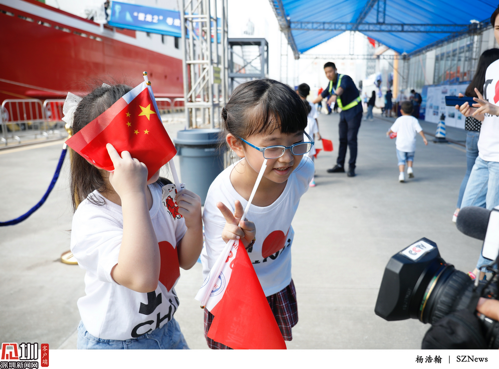 2019年10月14日,蛇口游輪母港CR2碼頭,兩位即將參觀“雪龍2”號科考破冰船的孩子們對起鏡頭比起手勢。