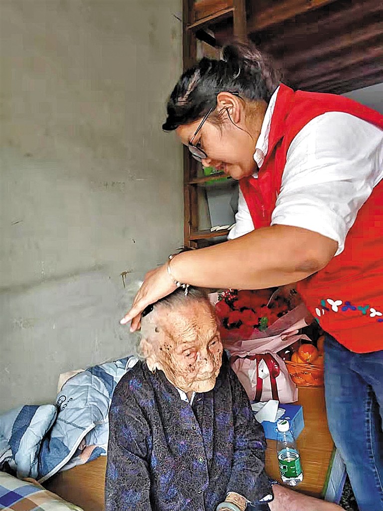 采訪當(dāng)天,老人看到來(lái)了這么多人,以為又是政府工作人員來(lái)慰問(wèn)她了,好奇地問(wèn)外孫女:“今天是過(guò)節(jié)嗎?”原來(lái),逢年過(guò)節(jié)陳汝金都會(huì)收到慰問(wèn)和祝福,社區(qū)工作人員和社康醫(yī)生也會(huì)經(jīng)常上門和她聊聊家常,了解老人家的身體狀況,因此老人對(duì)黨和政府送慰問(wèn)送祝福一點(diǎn)都不陌生。去年,陳汝金老人剛滿百歲,鳳凰社區(qū)黨委還專門組織大家來(lái)到老人家中,為老人慶祝百歲生日,并送來(lái)大家的祝福和問(wèn)候。