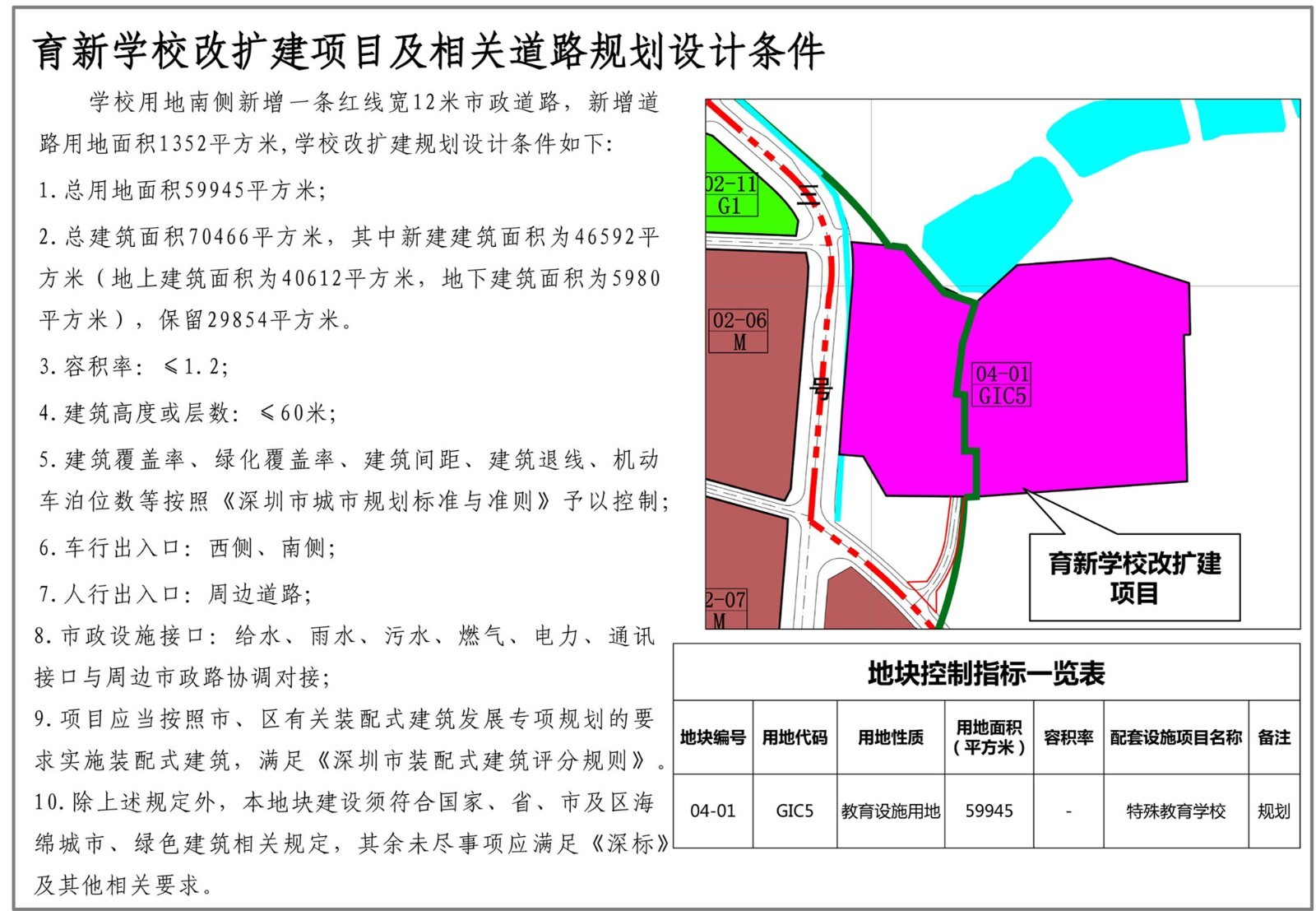 深圳市育新學校位于光明街道碧眼社區(qū),規(guī)劃觀光路(現狀已建)和二十三號路(現狀已建)交叉口西北側。為消除校園消防、交通出行安全隱患,滿足規(guī)范需求,新增學校用地1550平方米,以解決消防、交通需求,并結合周邊道路線形優(yōu)化西側邊界,學??傆玫孛娣e由58395平方米調整為59945平方米,學校用地南側新增一條紅線寬12米市政道路,道路用地面積1352平方米。