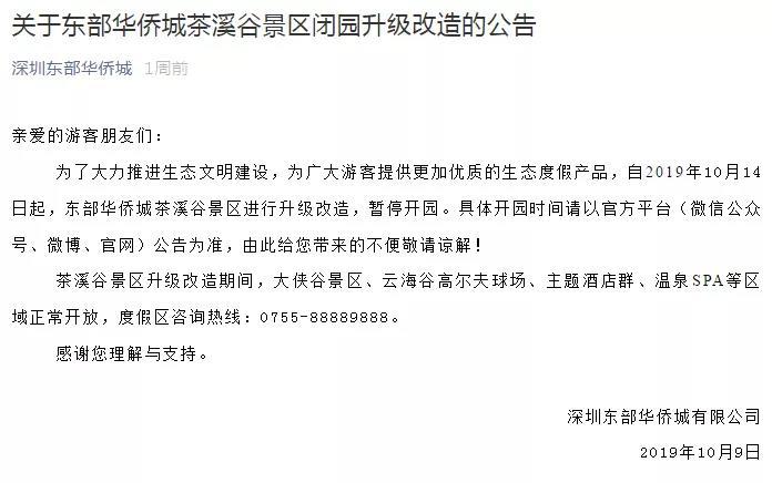 據(jù)深圳東部華僑城官方微博消息,自2019年10月14日起,東部華僑城茶溪谷景區(qū)進(jìn)行升級(jí)改造,暫停開(kāi)園。
