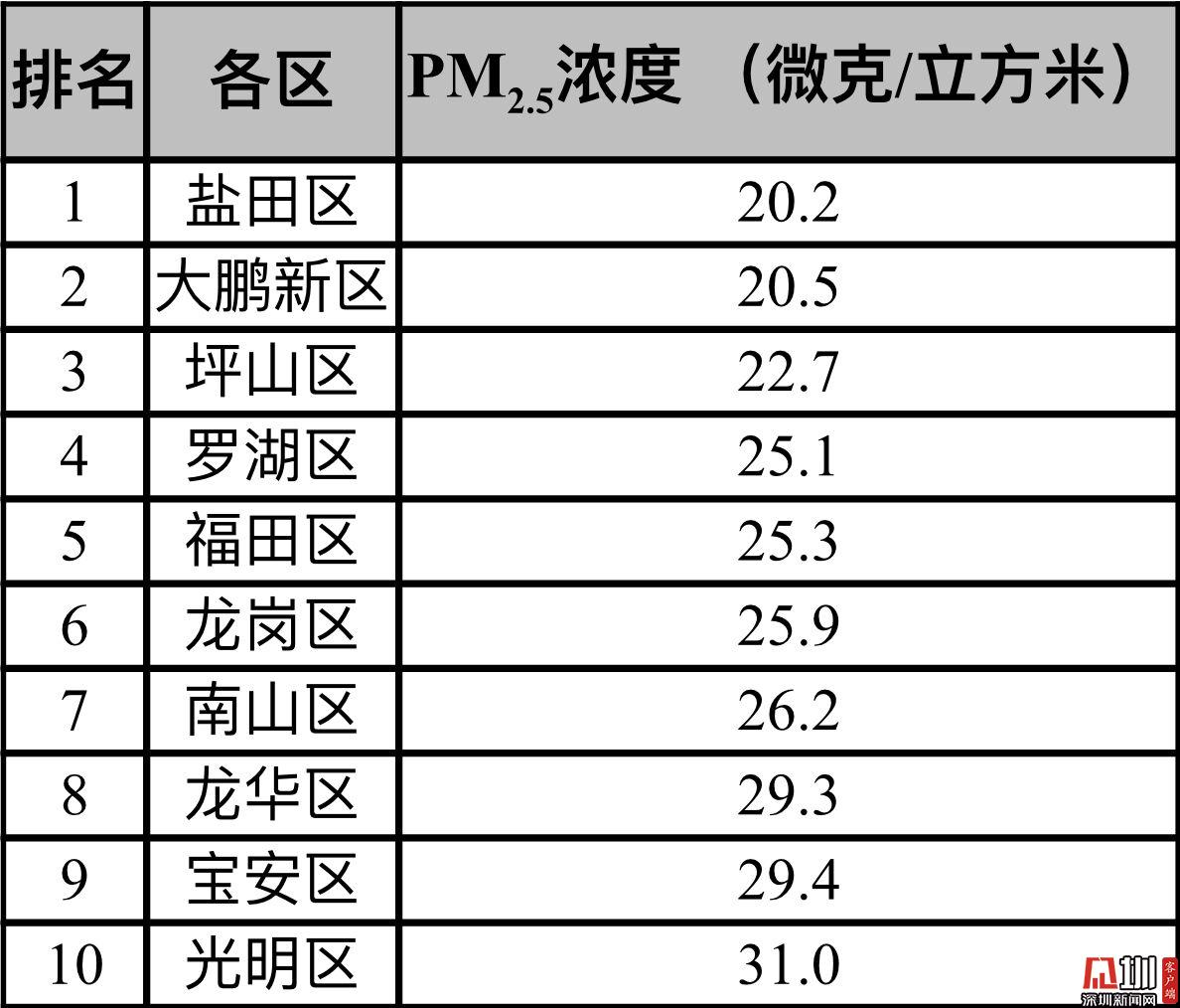 此外,各區(qū)PM2.5平均濃度在20.2-31.0微克/立方米之間,濃度較低的有鹽田、大鵬、坪山,濃度較高的有光明、寶安和龍華。