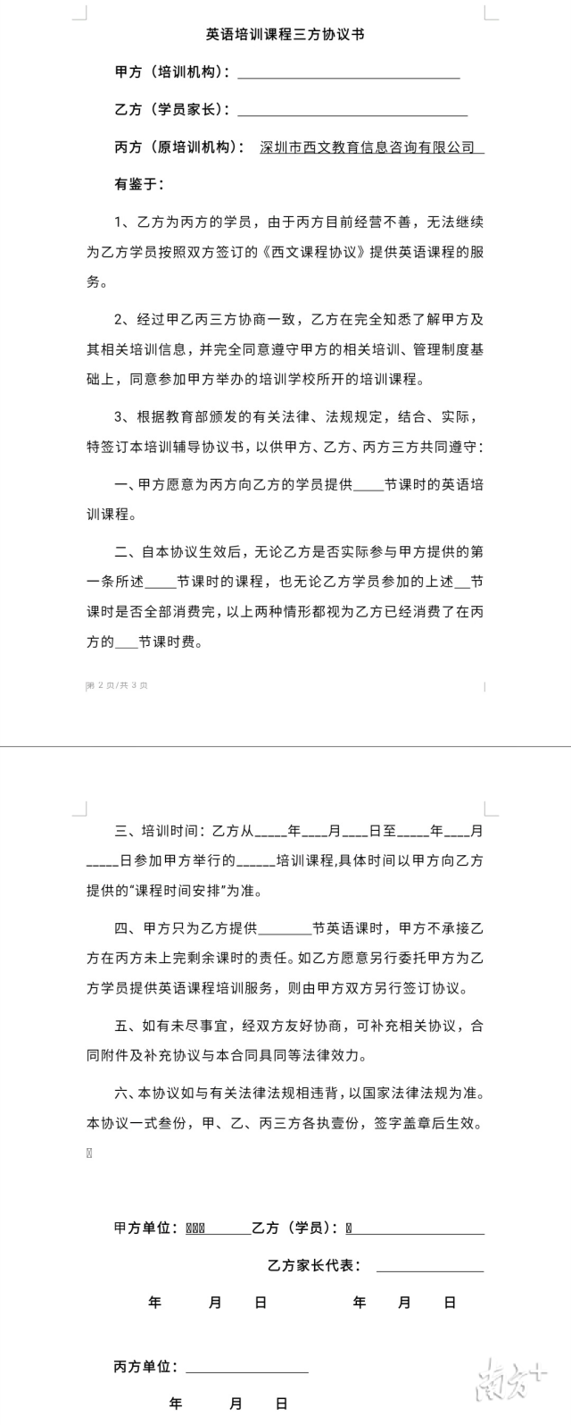 退費群里的周女士介紹,10月20日,西文英語提供了一份“英語培訓(xùn)課程三方協(xié)議書”,但上面很多條款都沒有寫清楚。西文英語委托的律師稱,山姆大叔少兒英語愿意給西文英語的學(xué)員免費提供30節(jié)課程,但學(xué)員在西文英語其他剩余課時的解決方案,需自行和山姆大叔協(xié)商。