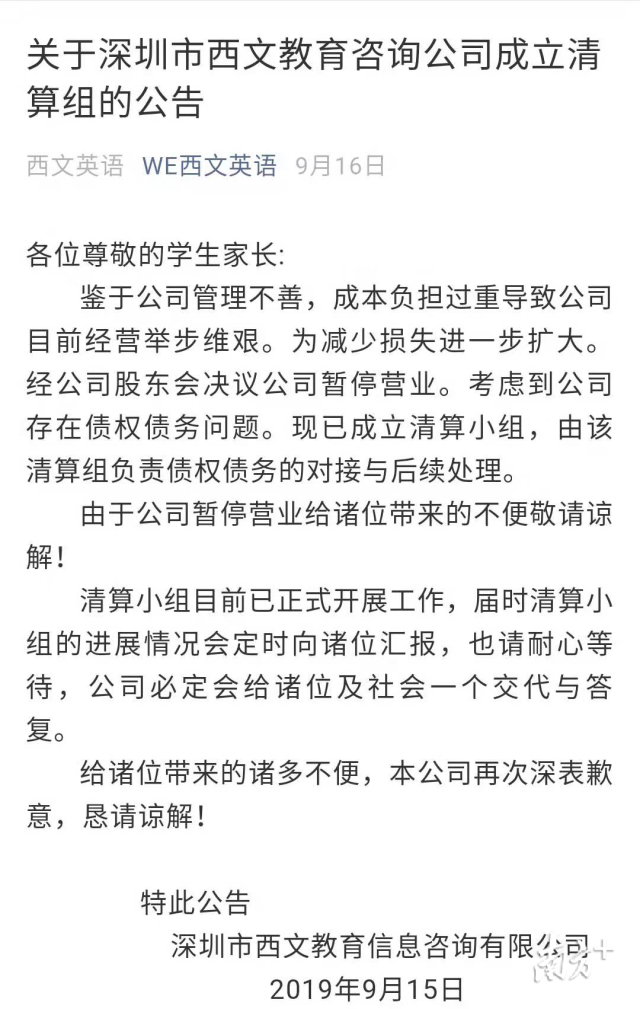 西文英語:公司已成立清算組負(fù)責(zé)學(xué)生學(xué)費善后事宜