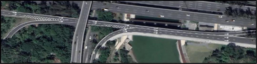 重新劃分之后的車道為1條濱海大道直行車道和2條沙河西路右轉(zhuǎn)濱海大道車道。同時(shí),將直行車流與右轉(zhuǎn)車流的虛線已經(jīng)改為實(shí)線,沙河西右轉(zhuǎn)車流禁止駛?cè)雰?nèi)側(cè)車道,防止兩股車流交織。