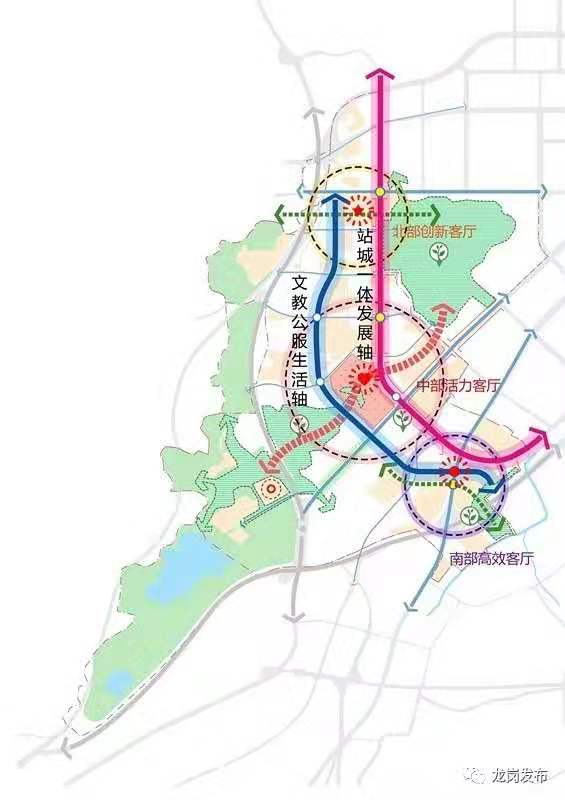2019年7月,備受矚目的大運(yùn)新城城市設(shè)計(jì)成果經(jīng)深圳市規(guī)劃和自然資源局審議正式出爐。未來的大運(yùn)新城將是一座生態(tài)文明健康、學(xué)習(xí)文化濃厚、多維開放連接、創(chuàng)新活力迸發(fā)的高水平城市新客廳,形成“一主兩副、三心兩軸”的總體城市框架。其中“三心”為“一主兩副”三個(gè)城市客廳,即主客廳“中部活力客廳”,副客廳“北部創(chuàng)新客廳”和“南部高效客廳”?!皟奢S”為黃閣路“站城一體發(fā)展軸”和龍飛大道“文教公服生活軸”。