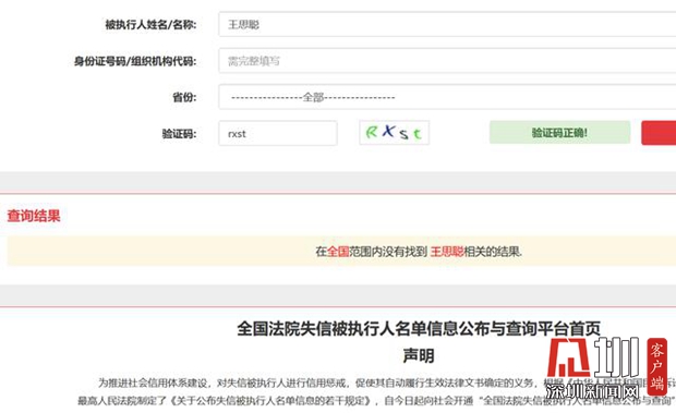 廣東丹柱律師事務(wù)所律師張偉上了“全國法院失信被執(zhí)行人名單信息公布與查詢平臺”進行查詢,她說,“實際上王思聰并沒有上失信被執(zhí)行人名單(張偉律師查詢?nèi)缦聢D),只是媒體對‘失信’和‘強制執(zhí)行’的誤解。目前只是判決書出來以后被申請強制執(zhí)行了,但強制執(zhí)行立案也不一定會被列入失信人名單?!?/p>