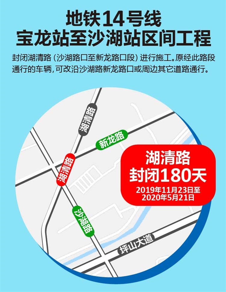2019年11月23日至2020年5月21日共180天,封閉湖清路(沙湖路口至新龍路口段)進(jìn)行施工。原經(jīng)此路段通行的車(chē)輛,可改沿沙湖路新龍路口或周邊其它道路通行。