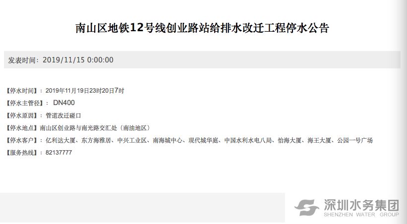 為配合南山區(qū)地鐵12號線創(chuàng)業(yè)路站給排水改遷工程,深圳水務(wù)集團(tuán)計劃于11月19日23時20日7時,對南山區(qū)創(chuàng)業(yè)路與南光路交匯處DN400供水管道進(jìn)行改遷碰口,屆時南油地區(qū)暫停供水。具體影響用戶為:億利達(dá)大廈、東方海雅居、中興工業(yè)區(qū)、南海城中心、現(xiàn)代城華庭、中國水利水電八局、怡海大廈、海王大廈、公園一號廣場。