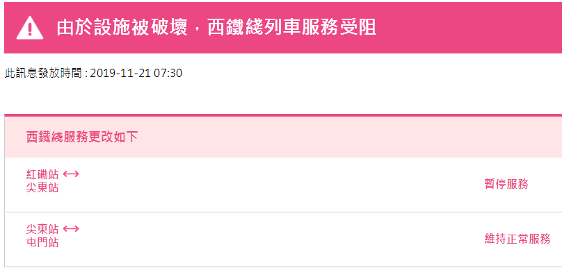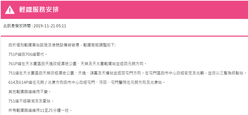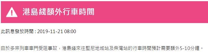 據(jù)港鐵消息,11月21日,香港地鐵各線(機場快線除外)、輕鐵及港鐵巴士的服務(wù)將于晚上11時結(jié)束。西鐵線/東鐵線紅磡站及大學(xué)站繼續(xù)關(guān)閉。需要注意的是,元朗站將于下午2時關(guān)閉,列車不停元朗站,此外,個別車站出入口會暫時關(guān)閉。