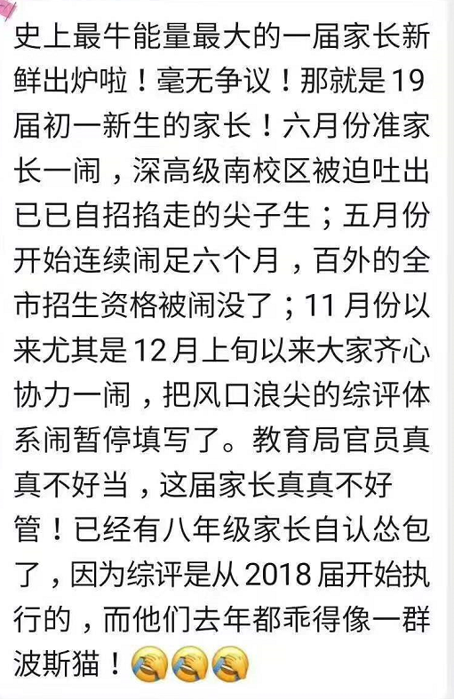 在家長的各種吐槽之下,12月11日,教育局召開了座談會:決定暫停2019年深圳市初中學生綜合素質(zhì)評價填報工作。