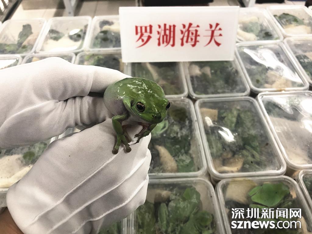 3月21日兩名旅客攜帶670只活體老爺樹蛙入境,被深圳海關(guān)隸屬羅湖海關(guān)當(dāng)場(chǎng)查獲。
