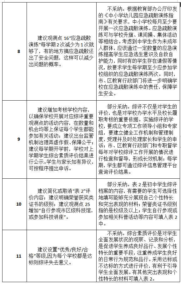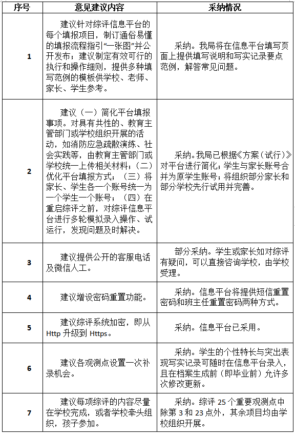 市教育局通報(bào)指出,在意見征集期間,該局共收到304個(gè)郵件及2個(gè)信件。市教育局對上述建議進(jìn)行了統(tǒng)一的分類,這些建議被分成了34類,并組織了專家學(xué)者進(jìn)行了認(rèn)真研究。其中,有關(guān)平臺簡化、允許修改更新、建立綜評宣導(dǎo)隊(duì)伍等14類建議被采納,另有5類建議被部分采納,余下15類建議沒有被采納。