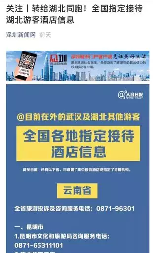 日前深圳就公布了一批指定接待湖北游客的酒店信息,深圳旅游業(yè)界積極行動(dòng),飯店協(xié)會(huì)業(yè)也發(fā)出倡議:疫區(qū)游客是我們的同胞,不僅不能歧視,要伸出援手幫助他們!