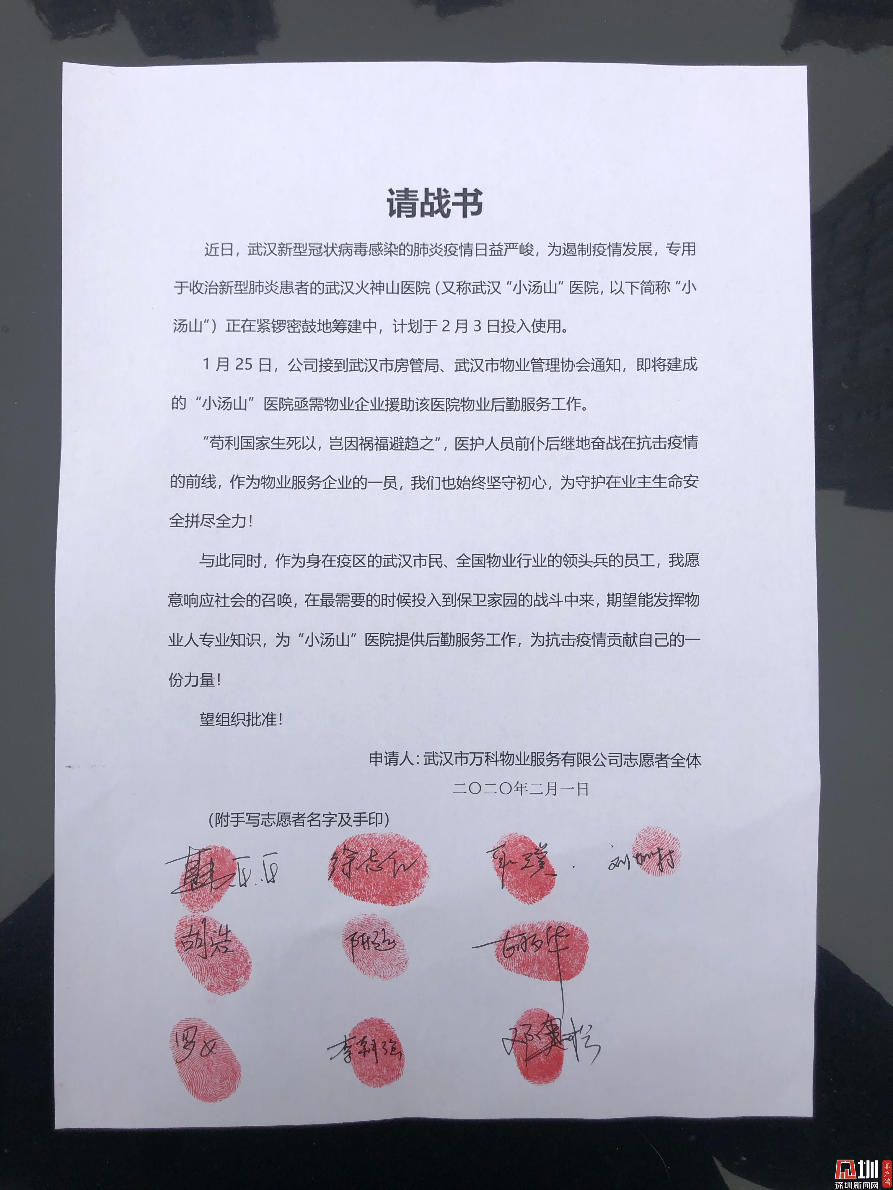 此次志愿者報名得到了大家的積極響應(yīng)。1月25日,武漢萬科物業(yè)接到武漢市物業(yè)管理協(xié)會的通知,希望萬科物業(yè)征集20名志愿者支援武漢火神山醫(yī)院。當(dāng)晚倡議書發(fā)出后,已有11人報名,到26日下午3時,報名人數(shù)增加到40人。這40位自愿報名者涵蓋了物業(yè)各個崗位,既有一線員工,也有物業(yè)管理人員。