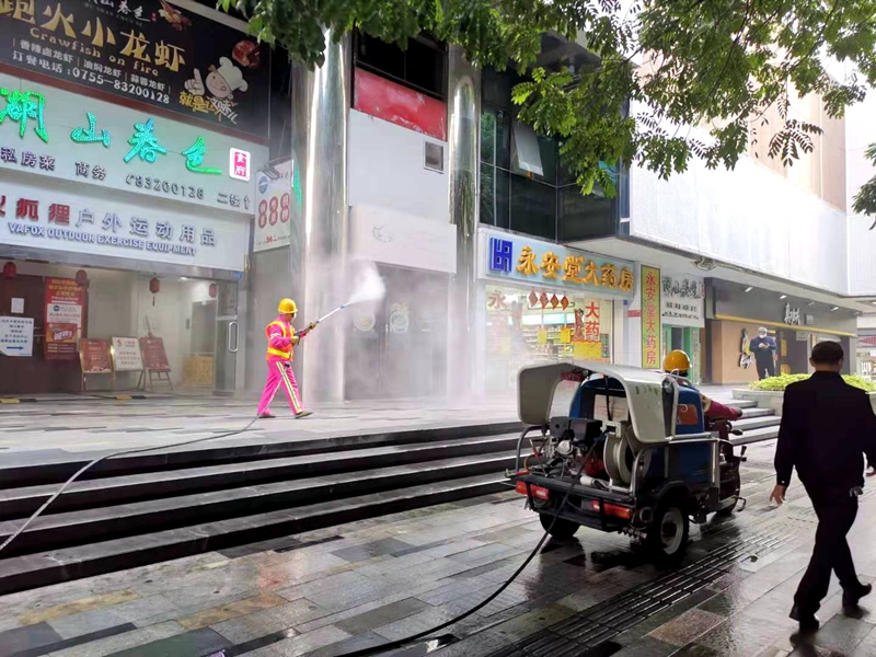 航苑大廈西座位于福田區(qū)華強(qiáng)北街道華航社區(qū),當(dāng)天下午,記者在航苑西座看到,有兩名值班保安在門(mén)口嚴(yán)格把關(guān),對(duì)每個(gè)進(jìn)入小區(qū)的住戶進(jìn)行體溫檢測(cè)。一輛灑水車(chē)正在圍繞小區(qū)噴灑消毒液。