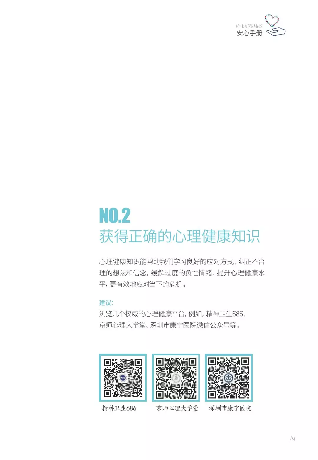 抗擊新型肺炎“安心手冊(cè)”由深圳市精神衛(wèi)生中心/深圳市康寧醫(yī)院支持,深圳市康寧醫(yī)院始建于1980年,是深圳市唯一一家集預(yù)防、醫(yī)療、康復(fù)、科研、教學(xué)于一體的公立三甲精神病??漆t(yī)院。2010年以來(lái),醫(yī)院連續(xù)九年名列復(fù)旦大學(xué)醫(yī)院管理研究所中國(guó)最佳專科排行榜精神??漆t(yī)院前十位;2017年榮膺第五屆全國(guó)文明單位;2019年精神科獲評(píng)廣東省高水平臨床重點(diǎn)??啤at(yī)院服務(wù)在各類顧客體驗(yàn)度和公眾滿意度測(cè)評(píng)中,名列前茅。