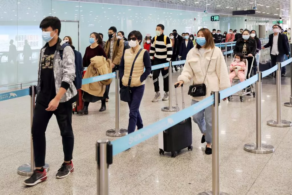 抵深旅客排隊(duì)前往出站口,旅客只需走過(guò),便可測(cè)出其體溫是否正常。