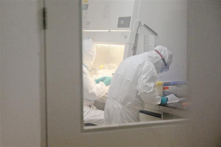 每次走進(jìn)實(shí)驗(yàn)室之前,武偉華都要穿好厚厚的防護(hù)服,從頭到腳全副武裝。打開(kāi)那扇通往實(shí)驗(yàn)室的厚重大門(mén),燈光在白色的墻壁上反射出冷冷的光,一直照到長(zhǎng)長(zhǎng)的走廊盡頭。走入實(shí)驗(yàn)室前,所有的技術(shù)人員還要經(jīng)過(guò)一個(gè)緩沖區(qū),這個(gè)區(qū)域每天要經(jīng)過(guò)數(shù)次化學(xué)消毒和紫外線消毒,保證致命病毒無(wú)法彌散。每結(jié)束一組檢測(cè),檢測(cè)人員還要再經(jīng)歷一次全面消毒,如此往復(fù)。