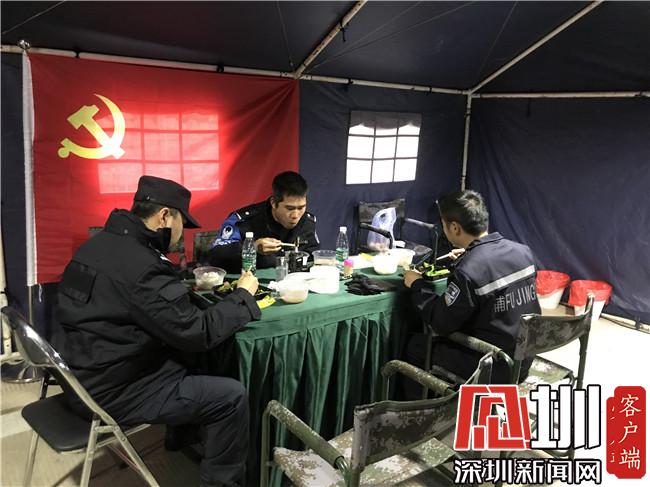 大鵬公安分局機訓大隊的隊員們在帳篷內(nèi)用午餐