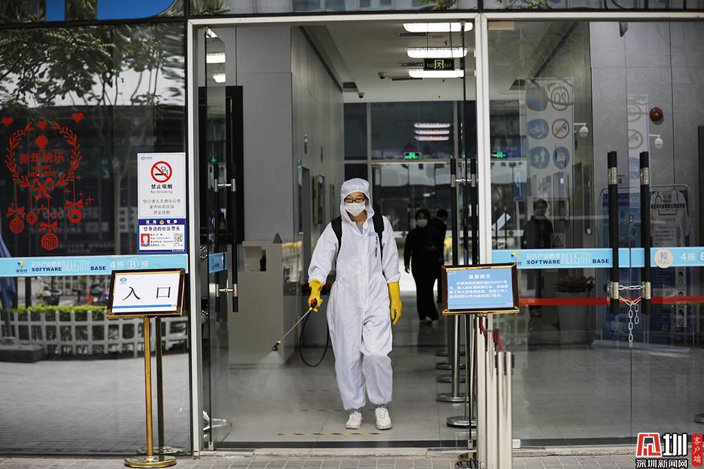 深圳軟件產業(yè)基地的一座辦公樓,一位正在進行消毒作業(yè)的工作人員。