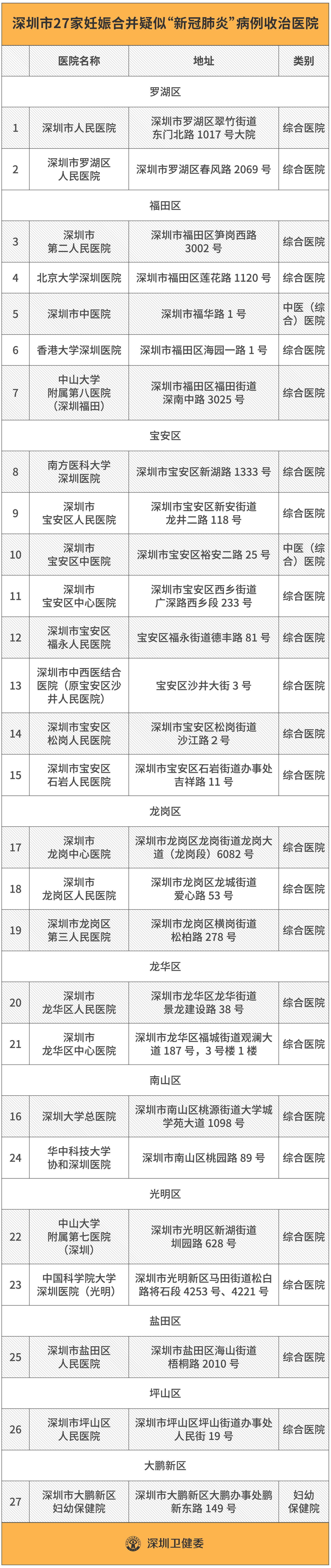 據(jù)悉,深圳共有27家妊娠合并新型冠狀病毒感染感染疑似病例市、區(qū)級收治醫(yī)院,其中,市級醫(yī)院8家,區(qū)級醫(yī)院19家,覆蓋深圳10個(gè)區(qū)(新區(qū))。
