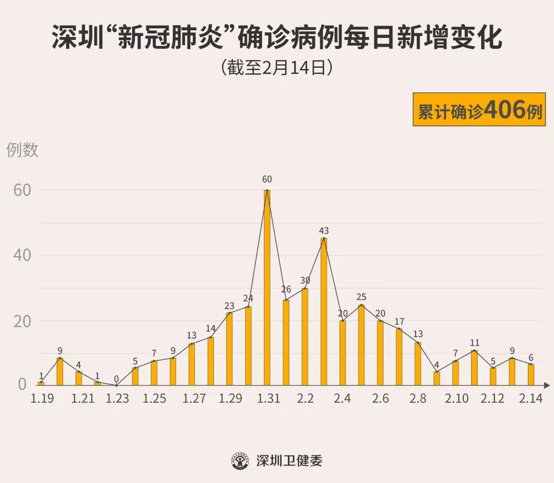 見(jiàn)圳客戶端·深圳新聞網(wǎng)2020年2月15日訊 截至2月14日24時(shí),深圳累計(jì)報(bào)告“新冠肺炎”確診病例406例。2月14日當(dāng)天全市新增確診病例6例(個(gè)案詳情今晚公布)。