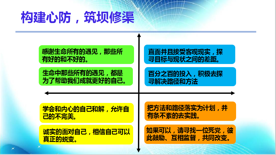 生命中所有的遇見,那些所有好的和不好的,都是為了幫助我們成就更好的自己。我們要學(xué)會(huì)和內(nèi)心的自己和解,允許自己的不完美,相信自己可以真正的蛻變。我們更應(yīng)該感謝生命所有的遇見,直面并且接受客觀現(xiàn)實(shí),探尋目標(biāo)與現(xiàn)狀之間的差距,進(jìn)而百分之百的投入,積極去探尋解決路徑和方法,把方法和路徑落實(shí)為計(jì)劃,并有條不紊的去實(shí)踐。如果可以,尋找一位死黨,彼此鼓勵(lì)、互相監(jiān)督,共同改變。