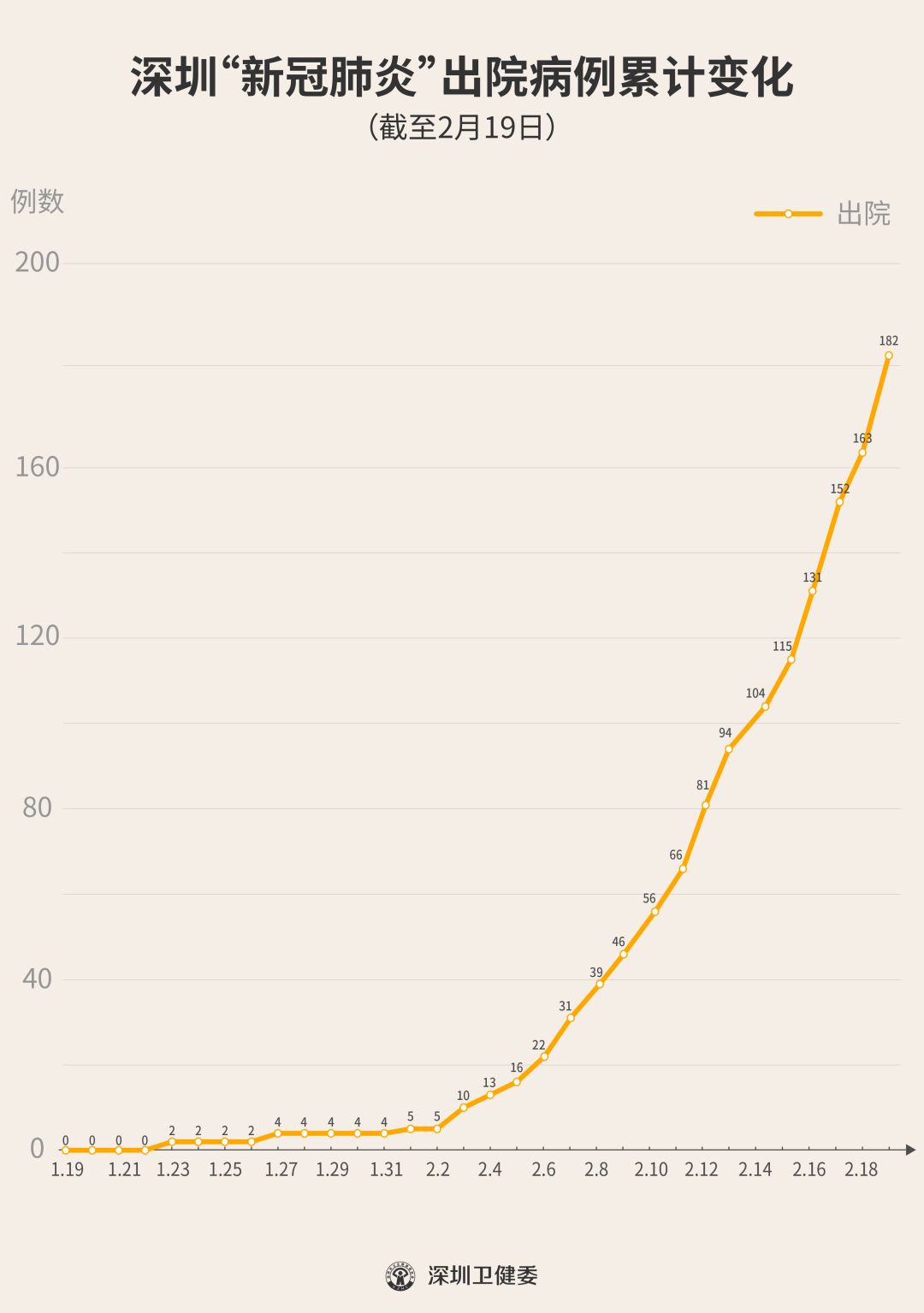 2月19日下午,經(jīng)專家組會診,深圳再有19名新型冠狀病毒肺炎確診患者出院,累計達182人,連續(xù)17天有人出院。