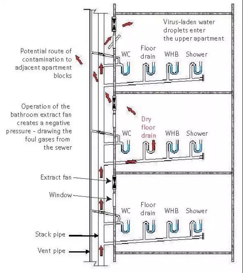 由于干涸的U型管內(nèi)存在帶病毒的污染物,而這些污染物處于暴露狀態(tài),可能通過地漏、甚至排風(fēng)扇循環(huán)等其中的污染顆粒被人吸入導(dǎo)致感染。