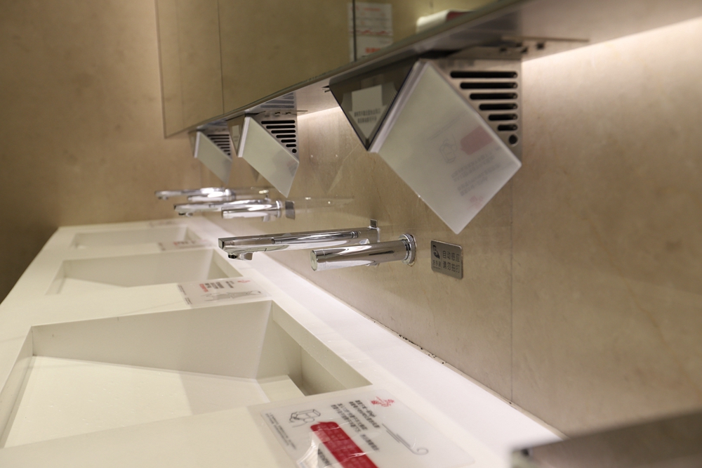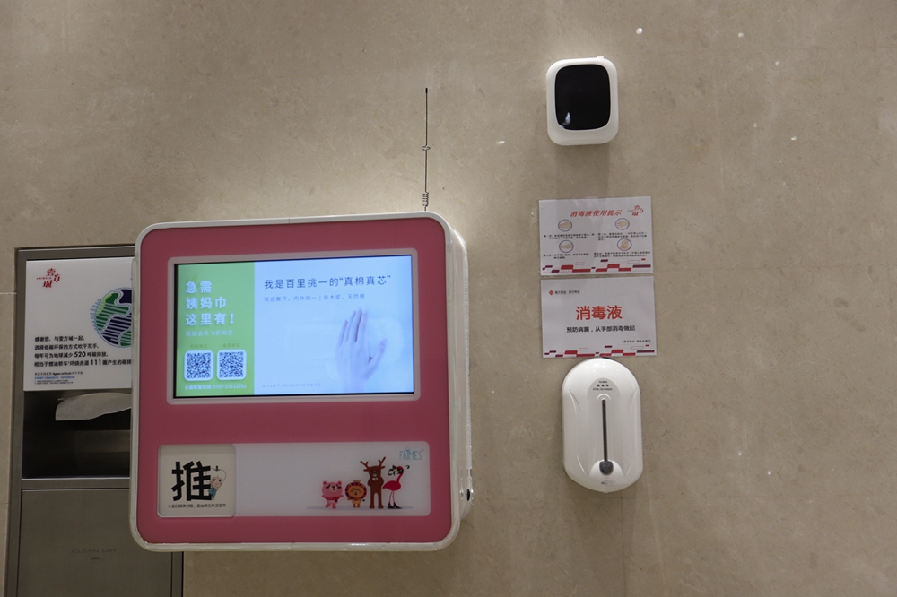 在一樓洗手間記者看到,洗手臺一側安置了消毒設備,并張貼使用提示。據(jù)悉,除了上述防疫物資,壹方城還采購了醫(yī)用手套、防護服、護目鏡以及消毒噴霧機3臺等,在所有出入口新增自動消毒設備55臺,在洗手間配置消毒設備186臺。