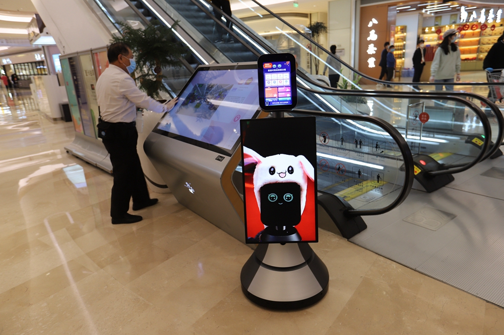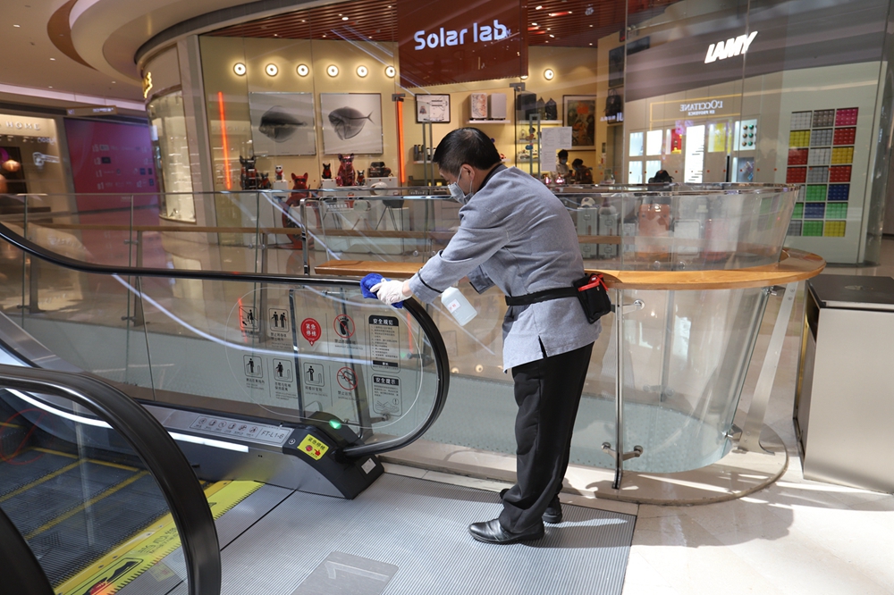 走在商場中,隨時可以看到保潔人員在消毒清潔。在商場一樓中庭導購屏和導購機器人處,保潔人員用消毒水反復擦拭屏幕。據(jù)悉,商場每小時巡回對扶梯、電梯、衛(wèi)生間、消防通道、導視屏、扶手欄桿、休閑椅、門把手、垃圾房、垃圾桶等地進行消毒。