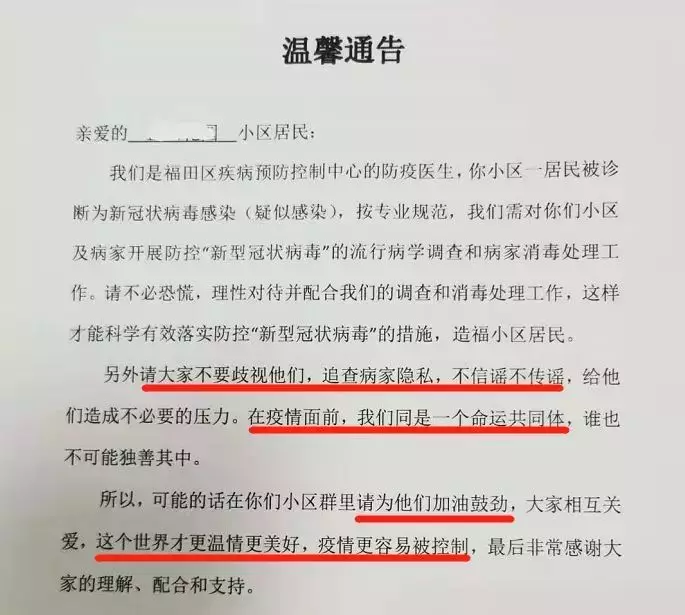 “疫情面前,我們同是一個(gè)命運(yùn)共同體”“大家相互關(guān)愛,這個(gè)世界才更溫情美好,疫情更容易被控制……”1月30日,位于深圳福田區(qū)的一小區(qū)出現(xiàn)新冠肺炎疑似感染病例,福田區(qū)疾病預(yù)防控制中心的防疫醫(yī)生隨即發(fā)布了這則通告,瞬間刷屏了深圳人的朋友圈。通告除了呼吁小區(qū)居民配合調(diào)查及消毒處理工作外,還特地懇請(qǐng)大家“不要歧視,在疫情面前,我們是同一個(gè)命運(yùn)共同體,誰(shuí)也不可能獨(dú)善其身?!绷攘葦?shù)字的“請(qǐng)求”,感動(dòng)無(wú)數(shù)人。