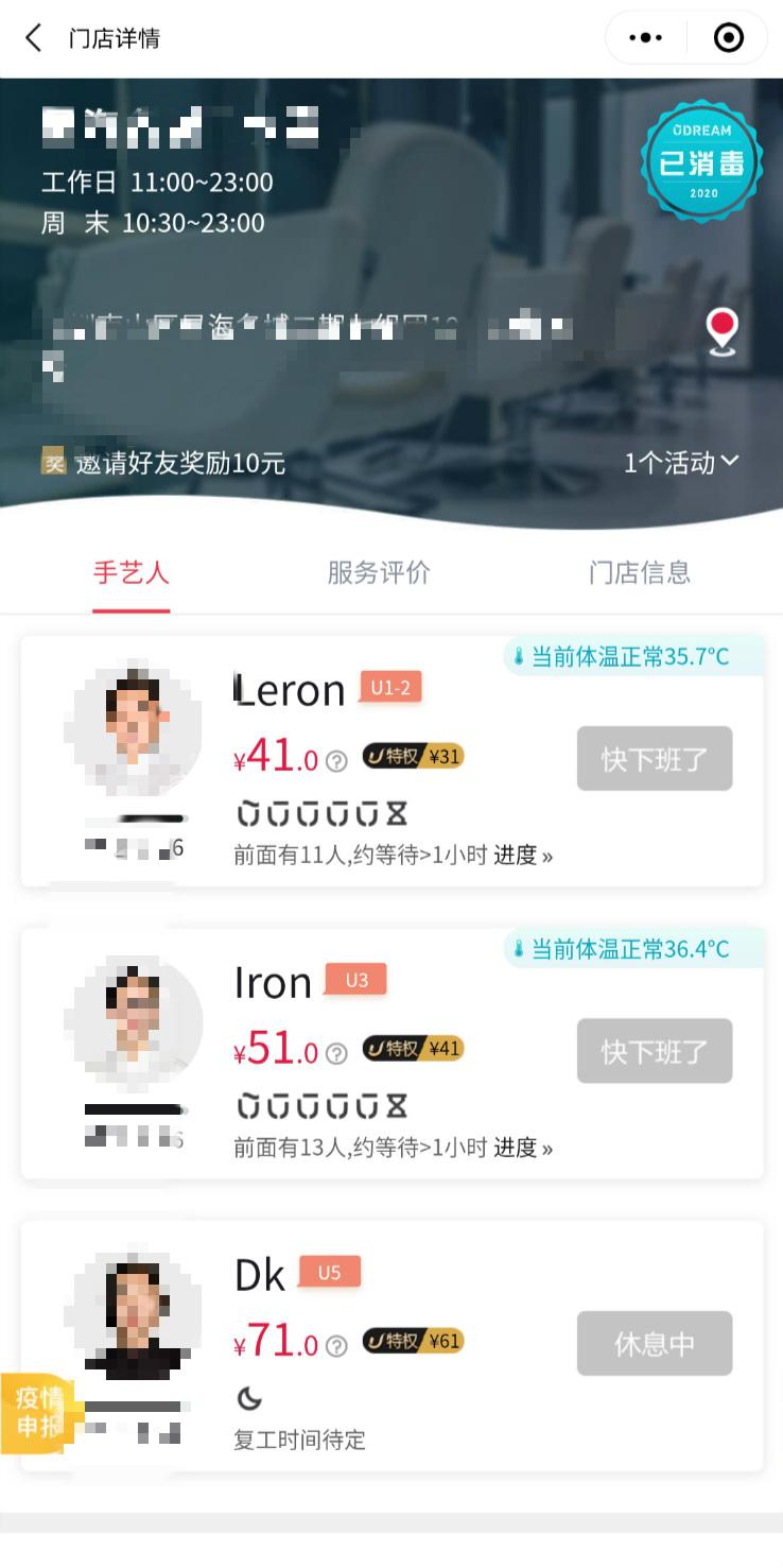 ▲通過線上平臺(tái),顧客可以清晰了解門店消毒情況及理發(fā)師個(gè)人體溫。