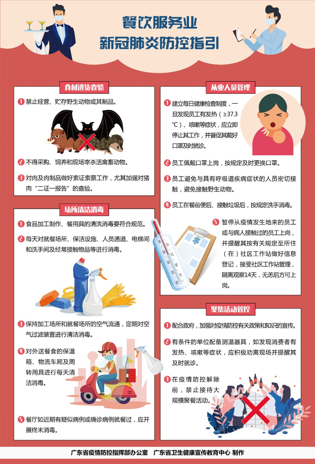 1、嚴(yán)格按照《機(jī)關(guān)、企業(yè)及工廠節(jié)后復(fù)工防控新型冠狀病毒肺炎工作指引》(粵衛(wèi)疾控函〔2020〕14號)、《餐飲服務(wù)食品安全操作規(guī)范》要求以及國家衛(wèi)生健康委員會《新型冠狀病毒感染的肺炎防控方案》《新型冠狀病毒感染的肺炎公眾防護(hù)指南》等防控要求,建立健全防控制度,壓實(shí)防控責(zé)任,嚴(yán)格從業(yè)人員管理,杜絕從業(yè)人員帶病上崗。