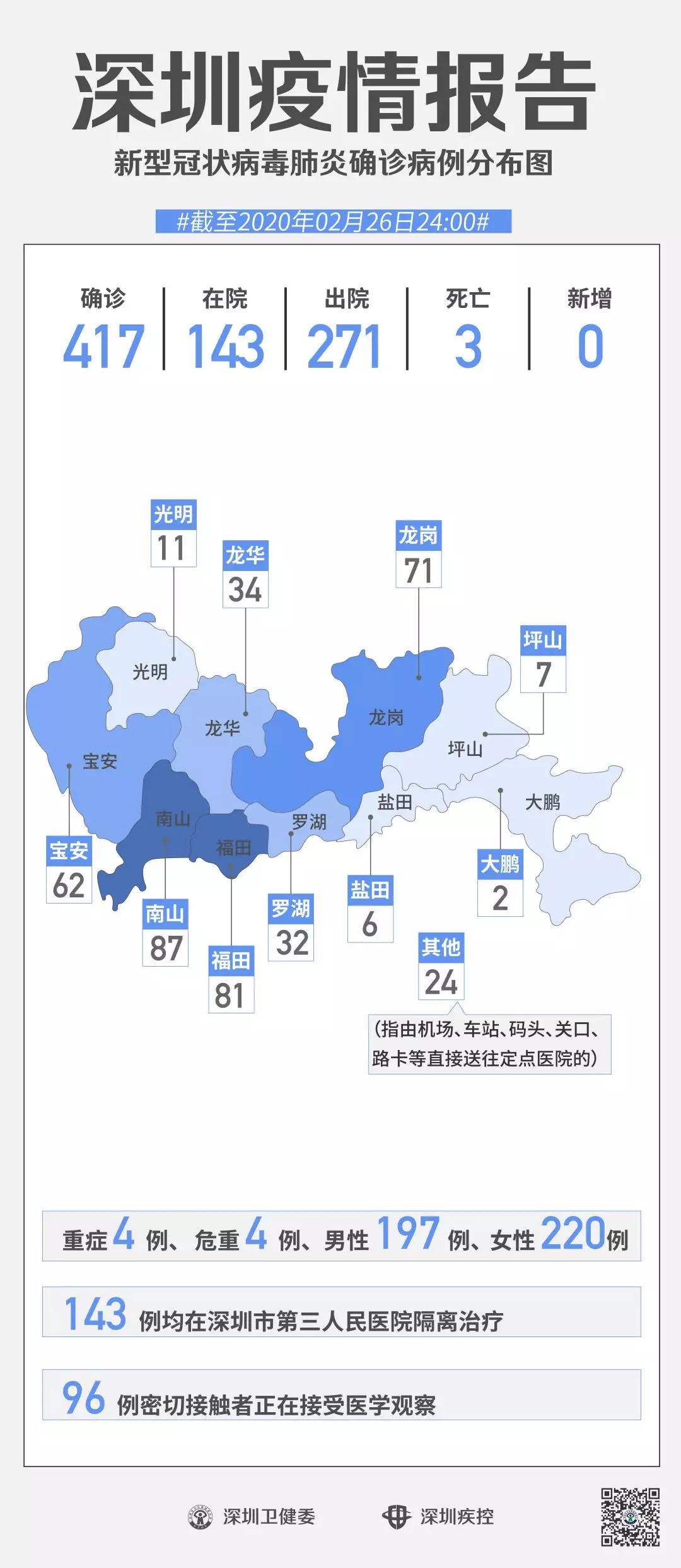 截至2月26日24時,深圳累計(jì)報(bào)告“新冠肺炎”確診病例417例。2月26日當(dāng)天全市無新增確診病例,當(dāng)天出院病例9例(從26日起不再公布出院個案)。
