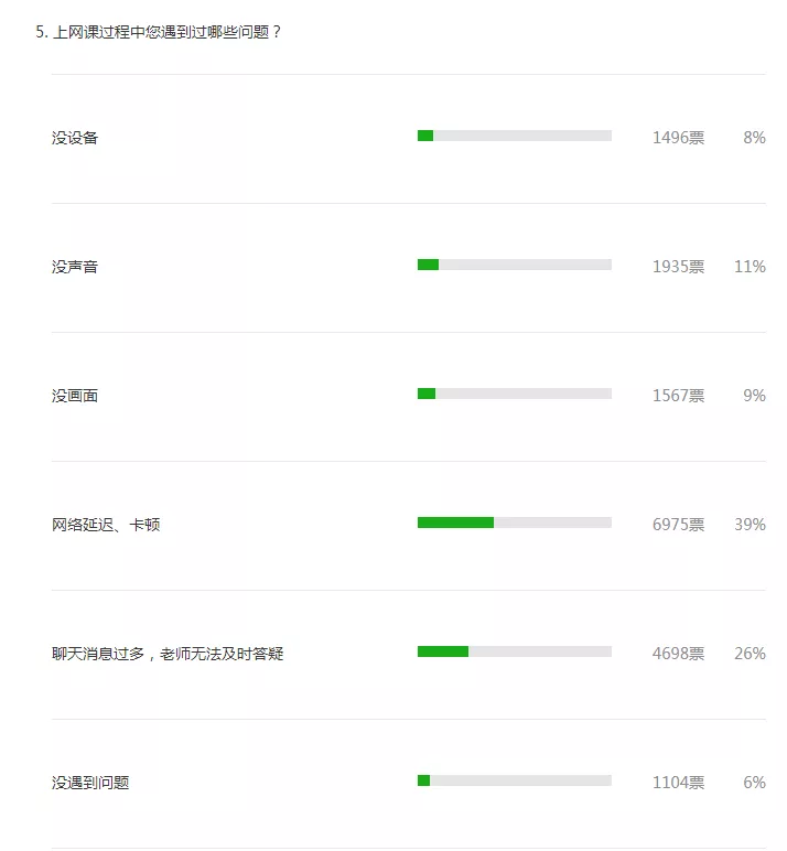 僅有6%的參與者在網(wǎng)課中從未遇到障礙。39%的參與者曾遇到網(wǎng)絡(luò)卡頓、延遲的問(wèn)題,20%的參與者曾遇到網(wǎng)課沒(méi)聲音、沒(méi)網(wǎng)絡(luò)等問(wèn)題。