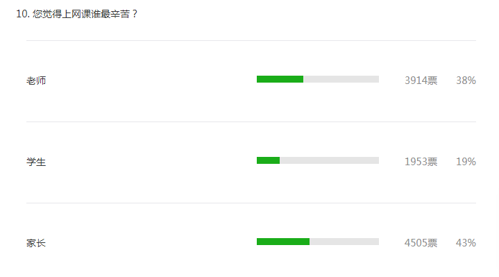 關(guān)于上網(wǎng)課誰最辛苦,有43%的參與者認(rèn)為家長最辛苦,38%認(rèn)為老師更辛苦。