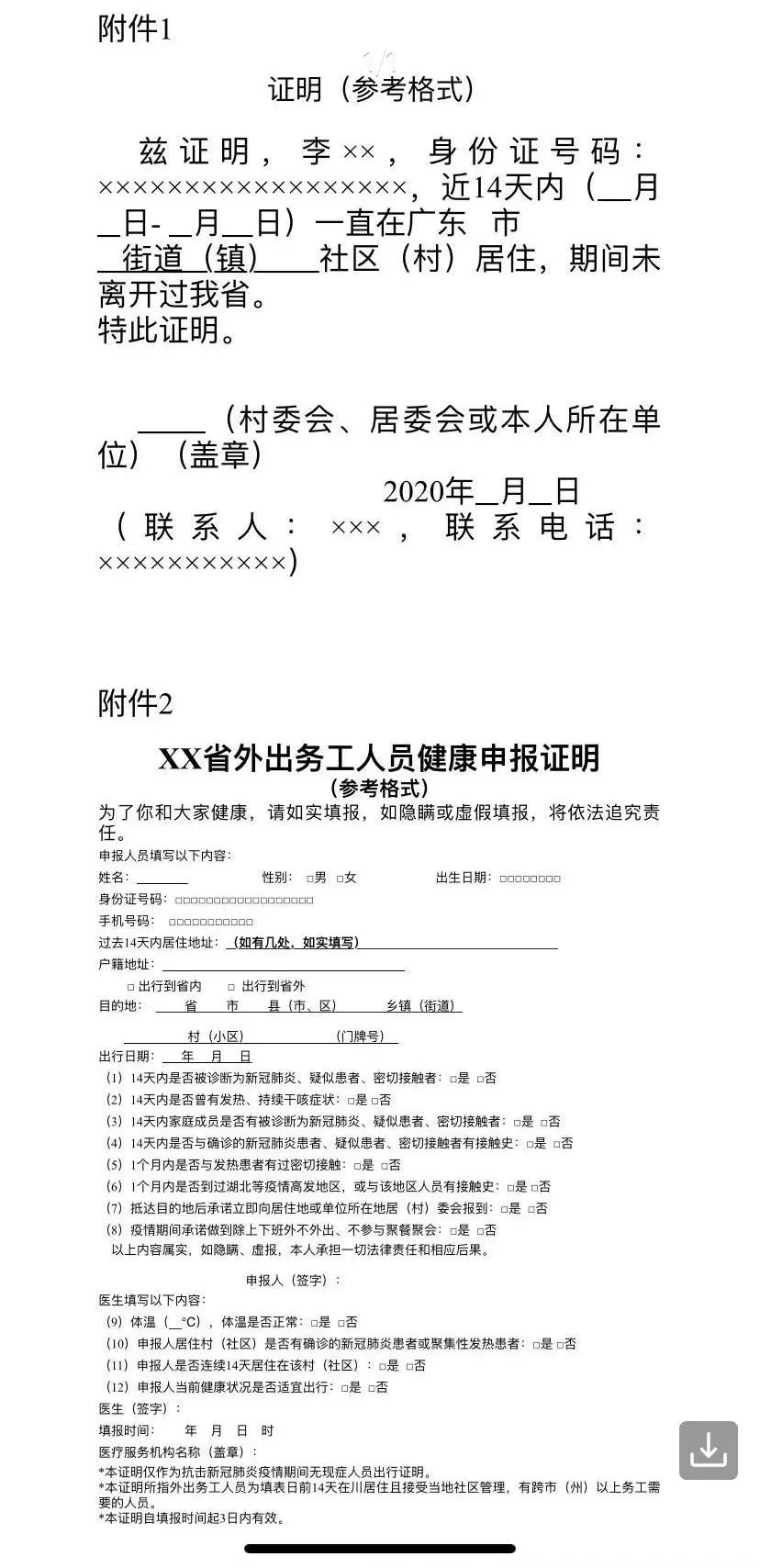 二、對(duì)持湖北省等疫情高發(fā)地區(qū)身份證來粵人員,如能提供中國移動(dòng)、中國電信和中國聯(lián)通發(fā)布的個(gè)人軌跡證明信息,證明本人14天內(nèi)未離開過廣東、未到過疫情高發(fā)地的,可到社區(qū)(居委或村委)或本人所在單位申領(lǐng)證明(見附件1)。
