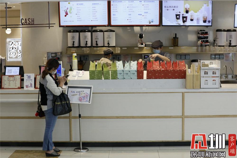 一個(gè)飲品店前,等待取餐的市民以及店員都有佩戴口罩。