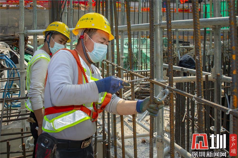 崗廈北地鐵施工工地,工人們佩戴好口罩進(jìn)行施工。