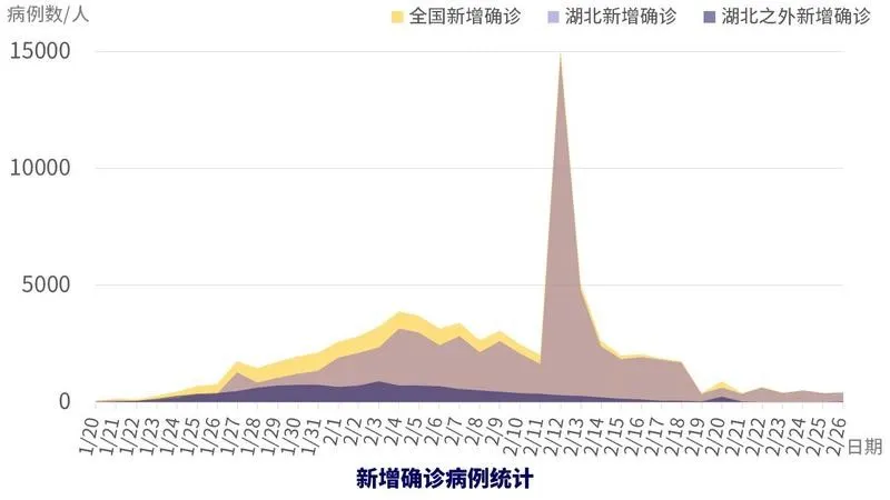 目前每日新增確診病例呈下降趨勢。2月3日,非湖北地區(qū)新增確診病例達到最高峰890例,之后逐漸下降(2月20日監(jiān)獄系統(tǒng)新增確診病例,造成數(shù)據(jù)波動),2月26日新增確診病例降至24例,為最高峰的2.7%,前一天新增病例5例,僅為最高峰的0.56%。湖北地區(qū)新增確診病例在2月4日達到最高峰3156例(2月12日,2月13日,由于確診標(biāo)準(zhǔn)的改變,造成數(shù)據(jù)波動),隨后基本呈下降趨勢,2月26日新增確診409例,為最高峰的12.96%。